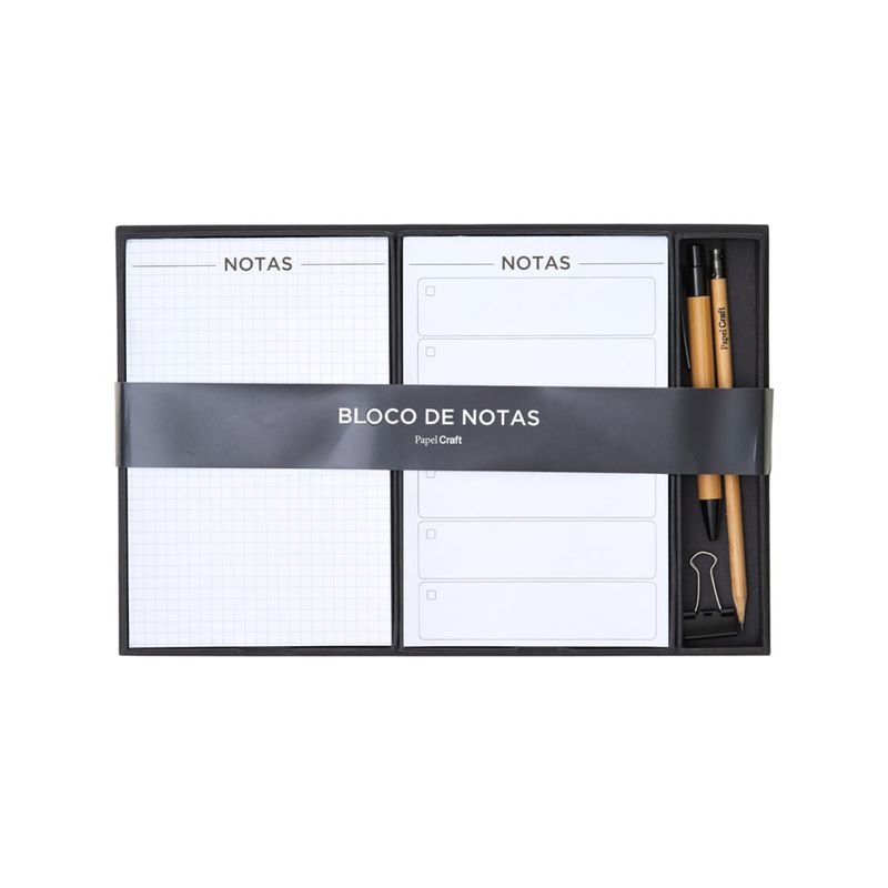 O Bloco Kit Notas vem com dois blocos para anotações – um pautado e outro em formato checklist –, além de um lápis, uma caneta e um clipe tipo binder. Ideal para o trabalho, estudos ou para o dia a dia em casa..