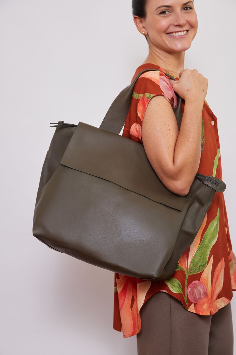 A bolsa de Couro legítimo tem acabamento fino, aba, fechamento em zíper e 2 alças: uma de ombro e uma de mão. A parte interna é forrada em tecido liso, com bolso para celular e outro bolso com fechamento em zíper.