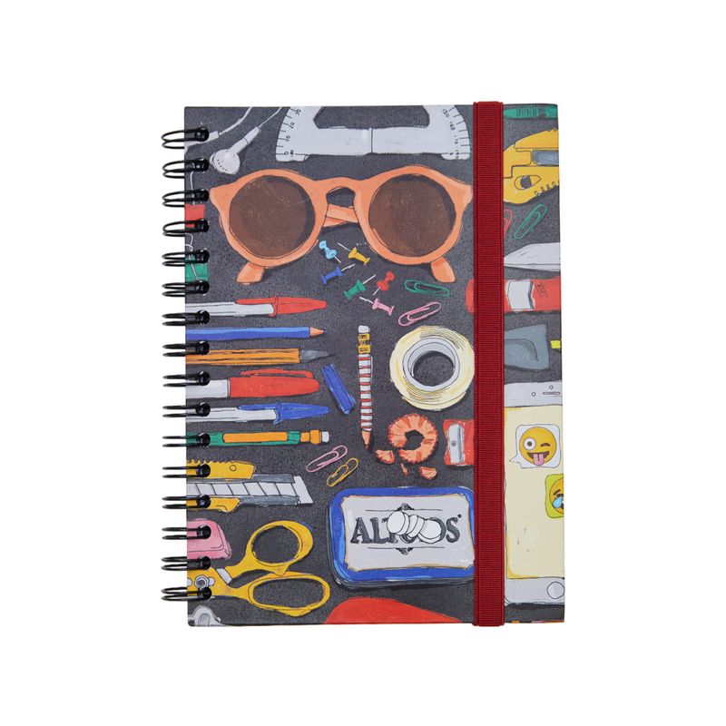 Caderno A5 pautado com capa rígida e fechamento em elástico reforçado, possui miolo com 90 folhas pautadas em papel Offset 75g e bolsa plástica para guardar trabalhos e anotações.