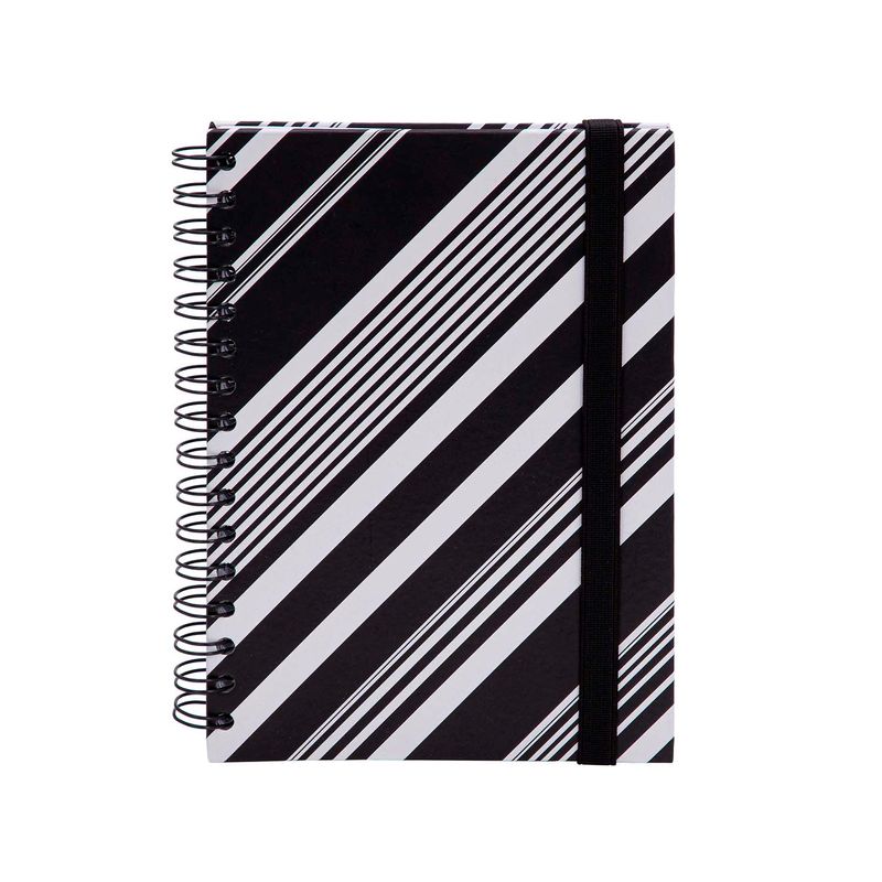 Caderno A5 pautado com capa rígida e fechamento em elástico reforçado, possui miolo com 90 folhas pautadas em papel Offset 75g e bolsa plástica para guardar trabalhos e anotações.
