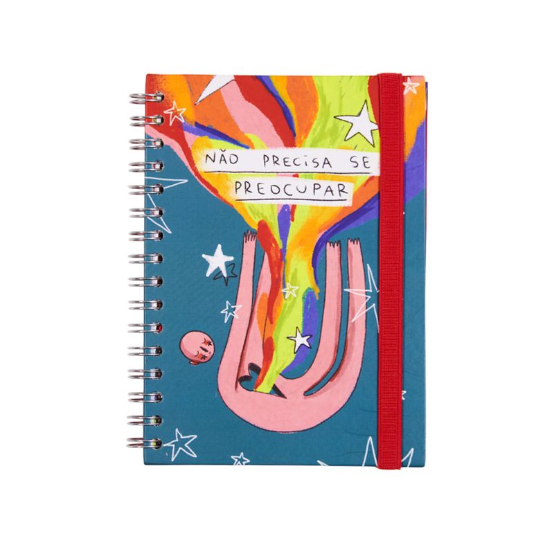 Caderno A5 pautado com capa rígida e fechamento em elástico reforçado, possui miolo com 90 folhas pautadas em papel Offset 75g, bolsa plástica para guardar trabalhos e anotações e divisórias.