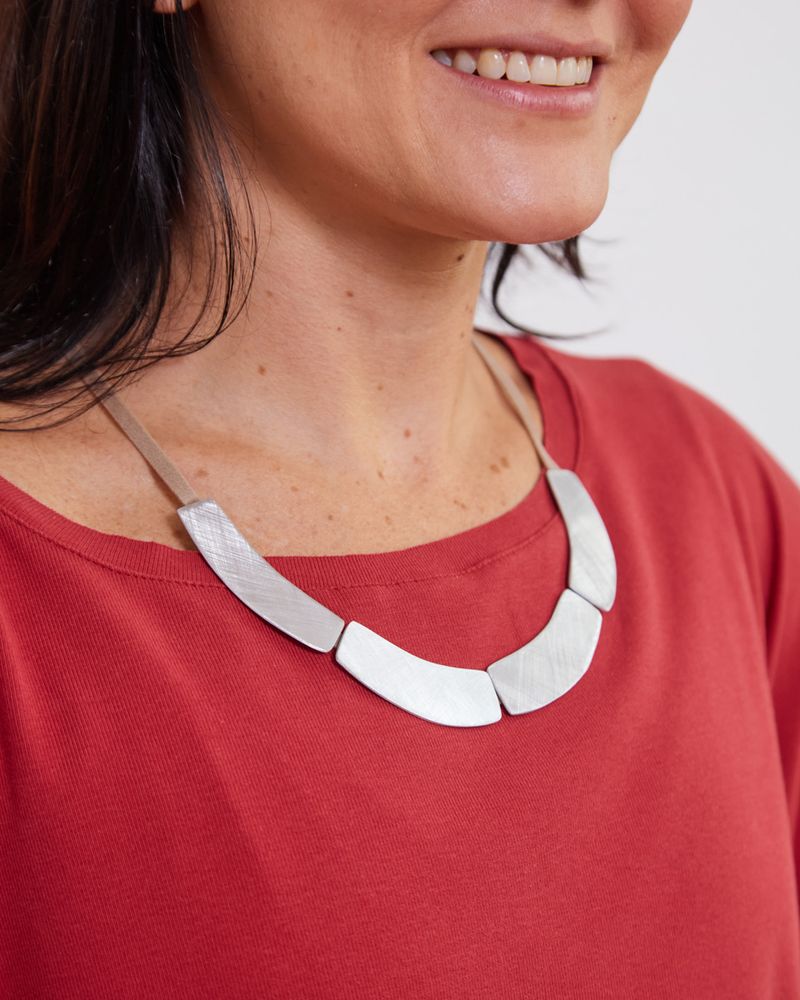 Use com vestidos, camisas ou blusas básicas — o brilho suave do alumínio destaca o colo e dá um charme sofisticado às produções do dia a dia ou da noite.