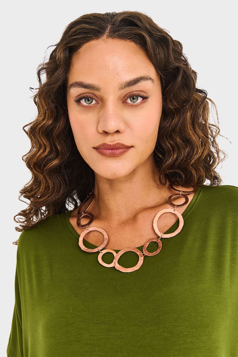 O Colar Elos Cobre é uma peça que vai acrescentar e fazer toda a diferença em qualquer look básico.É um modelo sofisticado e estiloso que traz muita elegância e versatilidade em qualquer produção.