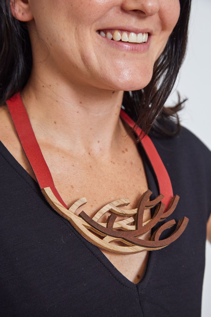 O aplique de madeira em tons naturais cria curvas fluidas que lembram raízes, enquanto a faixa em couro vermelho adiciona contraste vibrante e modernidade — um equilíbrio ousado para quem ama acessórios que contam histórias.