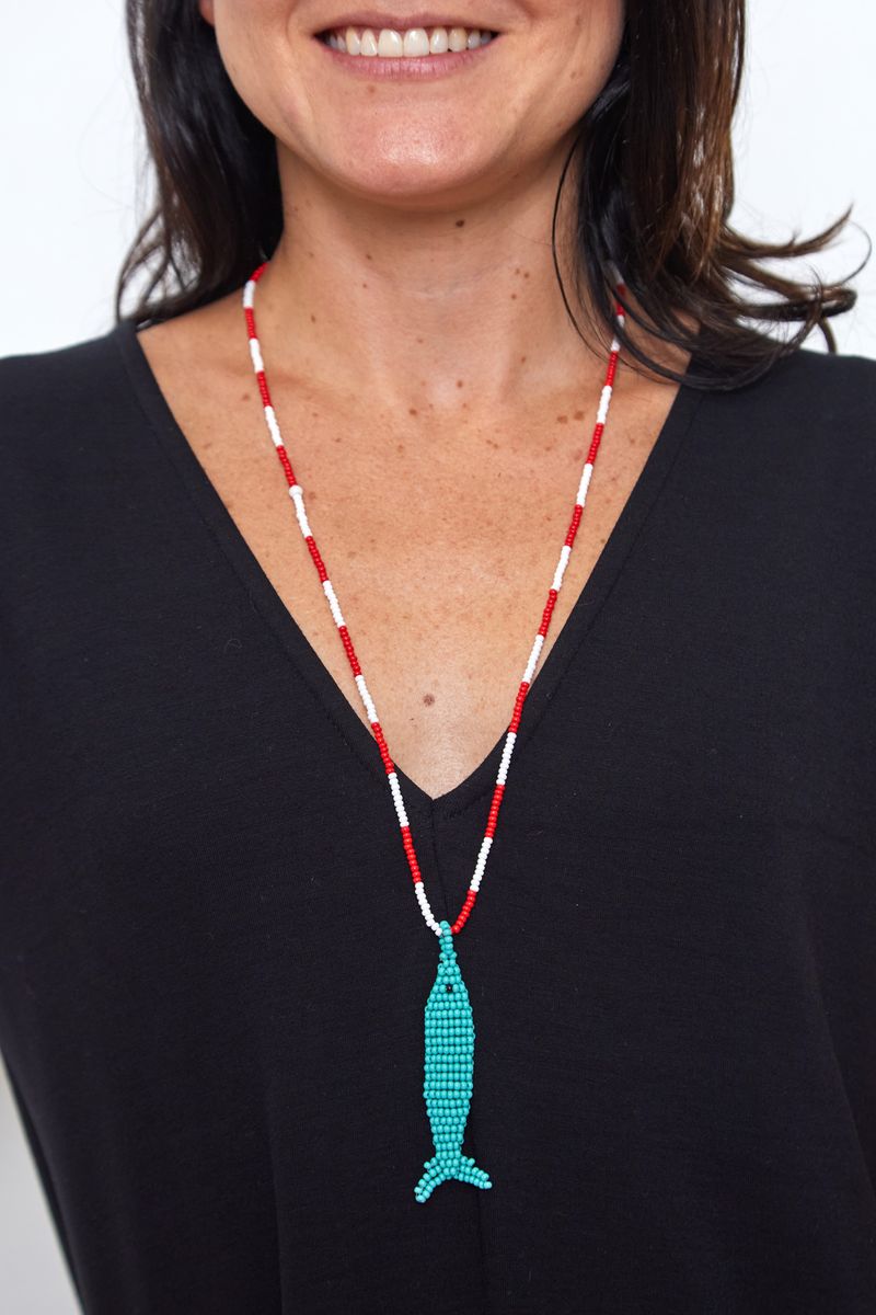 O pingente de peixe alongado é feito à mão com miçangas turquesa, criando textura e movimento. A corrente alterna tons de vermelho e branco, formando um contraste moderno e alegre, perfeito para looks casuais, despojados e urbanos.
