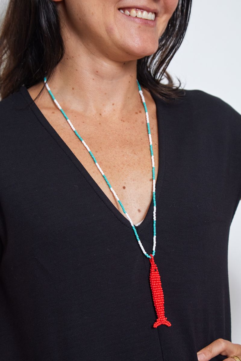 O pingente de peixe alongado é feito à mão com miçangas turquesa, criando textura e movimento. A corrente alterna tons de vermelho e branco, formando um contraste moderno e alegre, perfeito para looks casuais, despojados e urbanos.