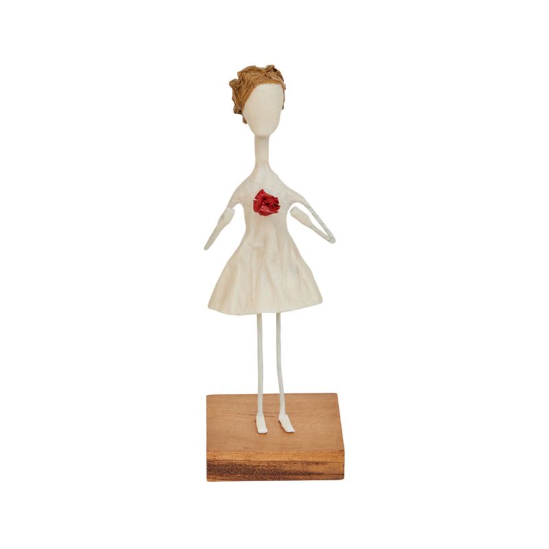 Delicada escultura artesanal feita em papel machê, com aproximadamente 20 cm de altura. A peça é montada sobre uma base de madeira, que garante estabilidade e elegância. Com traços minimalistas e formas suaves, é perfeita para presentear ou decorar ambientes com um toque de sensibilidade e arte.