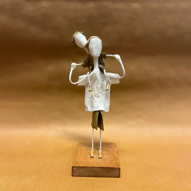 Delicada escultura artesanal feita em papel machê, com aproximadamente 20 cm de altura. Representa um momento de afeto entre pai e filho, com uma criança apoiada nos ombros do pai. A peça é montada sobre uma base de madeira, que garante estabilidade e elegância. Com traços minimalistas e formas suaves, é perfeita para presentear ou decorar ambientes com um toque de sensibilidade e arte.