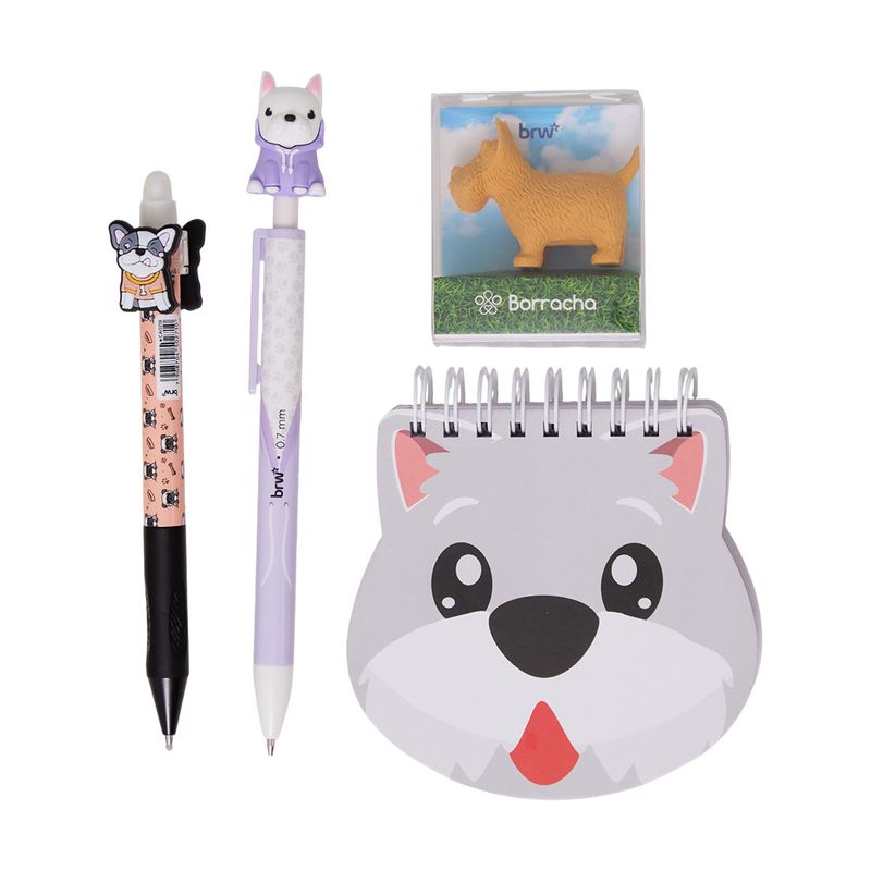 O kit acompanha um estojo em formato de cachorrinho, com acabamento macio e zíper resistente, além de acessórios que deixam qualquer mesa de estudo ou organização ainda mais divertida.