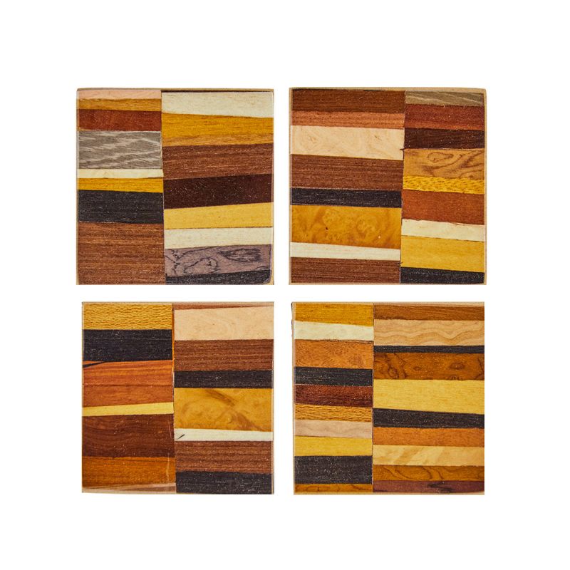 Kit com 4 porta-copos em madeira com técnica de marchetaria. Descanse os copos e taças sobre o conjunto para evitar manchas ou marcas sobre os móveis. Um item para fazer a diferença na ornamentação da sua mesa. Dimensões: L: 10 cm x A: 10 cm