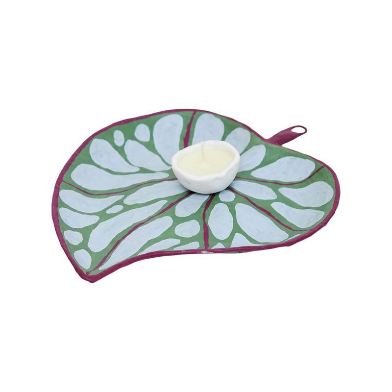 Peça artesanal produzida em papel machê, inspirada no formato orgânico de uma folha de begônia. Pintada à mão em tons de verde, lilás e branco, possui acabamento delicado que valoriza a textura e o desenho natural da planta. Acompanha uma pequena vela em suporte branco, ideal para criar uma atmosfera acolhedora e charmosa em qualquer ambiente. Pode ser usado como objeto decorativo, centro de mesa ou acessório para compor rituais e momentos especiais.